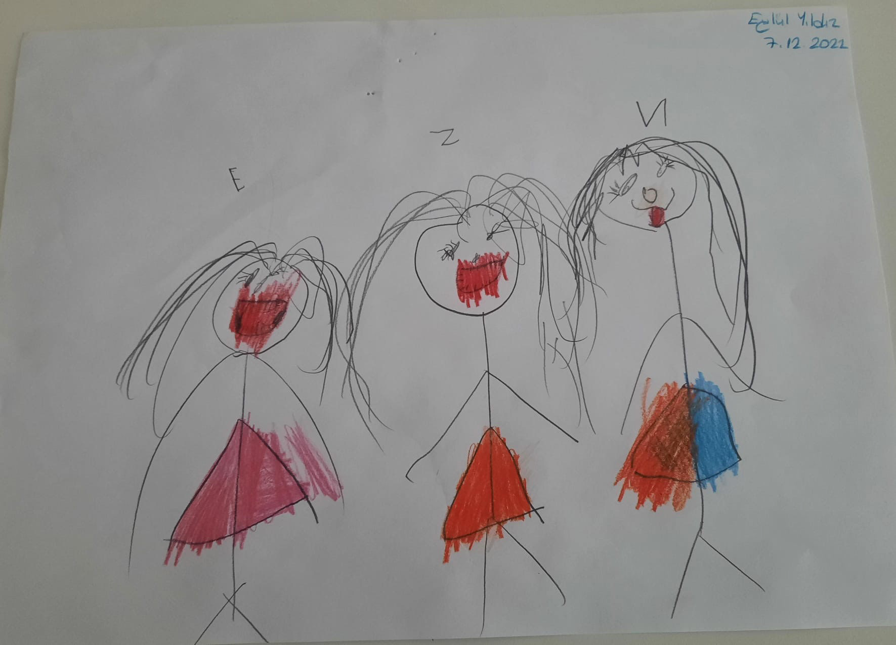 Eylul has drawn herself laughing and playing with her best friends in the Laughing Heals Association play center. They all love wearing colorful skirts. Eylul is dreaming of a happy world where children can safely laugh and play.